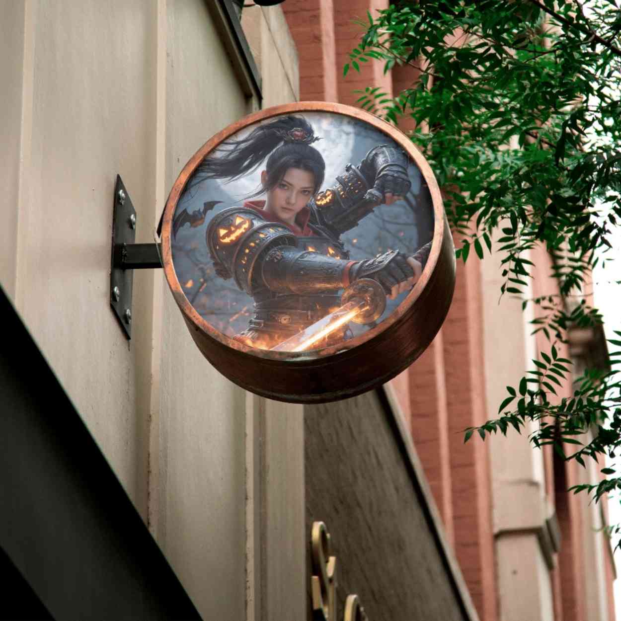 This digital artwork depicts a fierce female samurai warrior in a Halloween-inspired armor glowing with fiery energy.