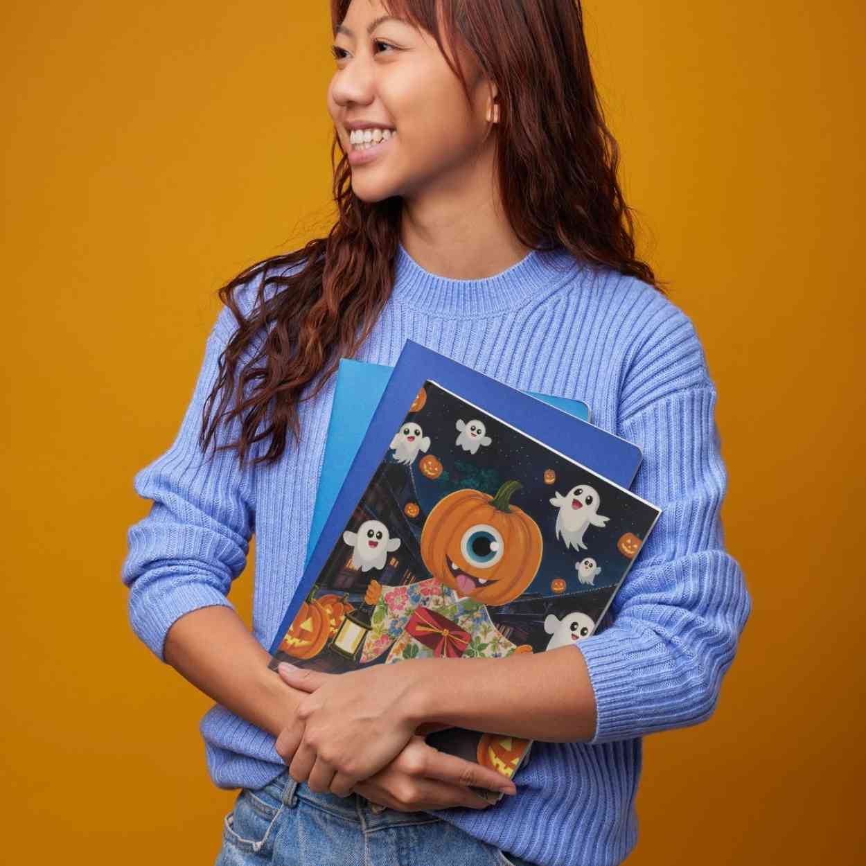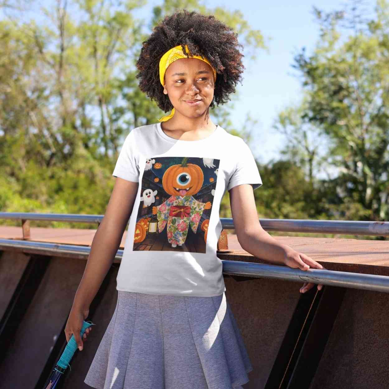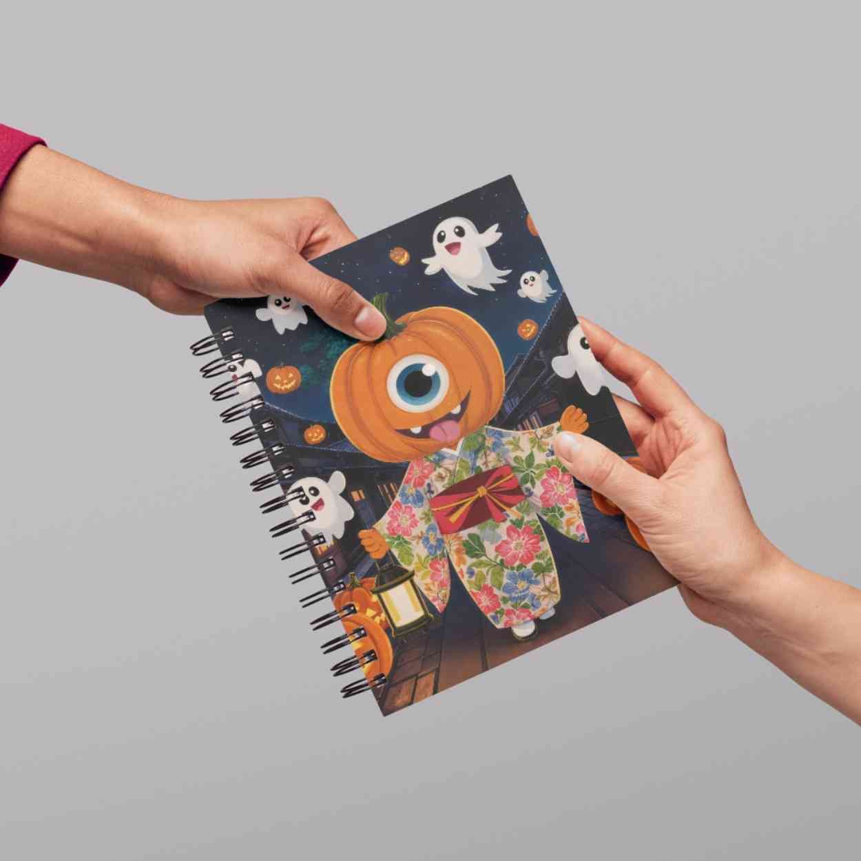 This digital artwork reimagines the legendary Hitotsume Kozo — Japan’s one-eyed yokai — as a cute pumpkin-headed spirit wearing a floral kimono, surrounded by glowing jack-o’-lanterns and playful ghosts.