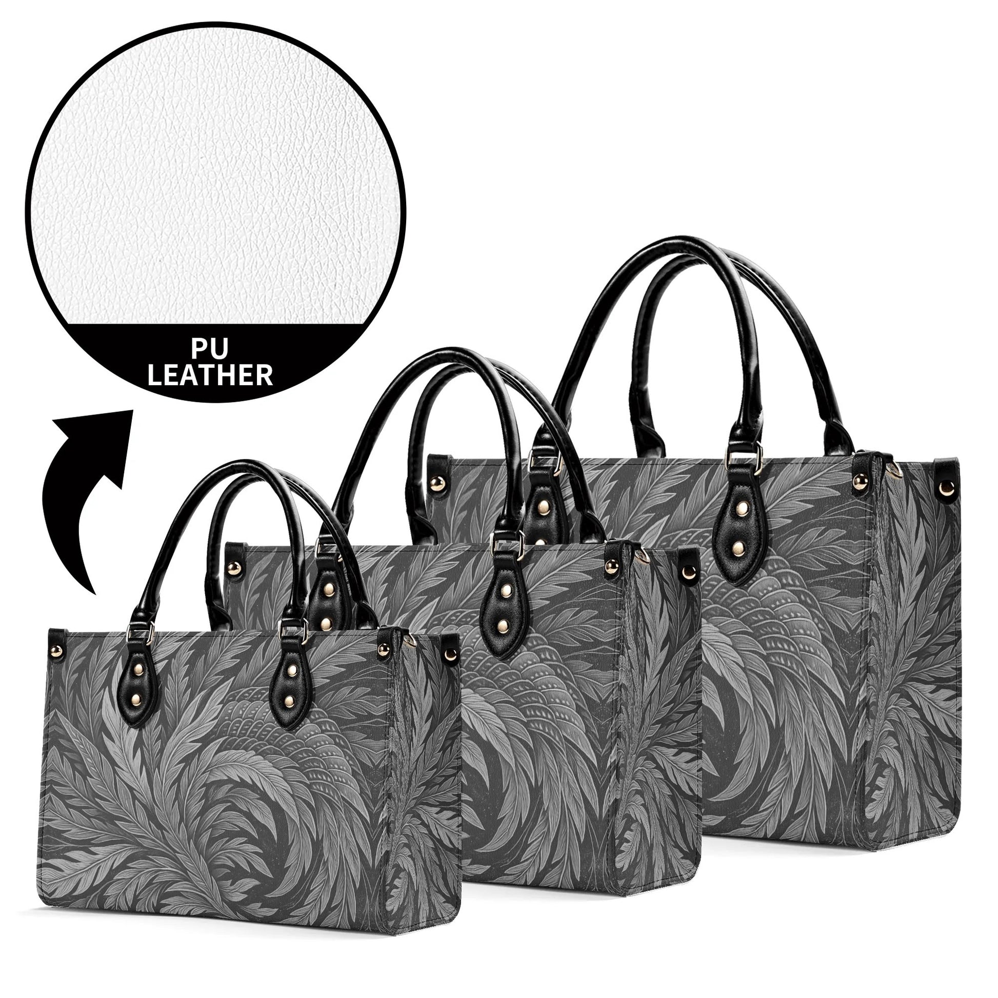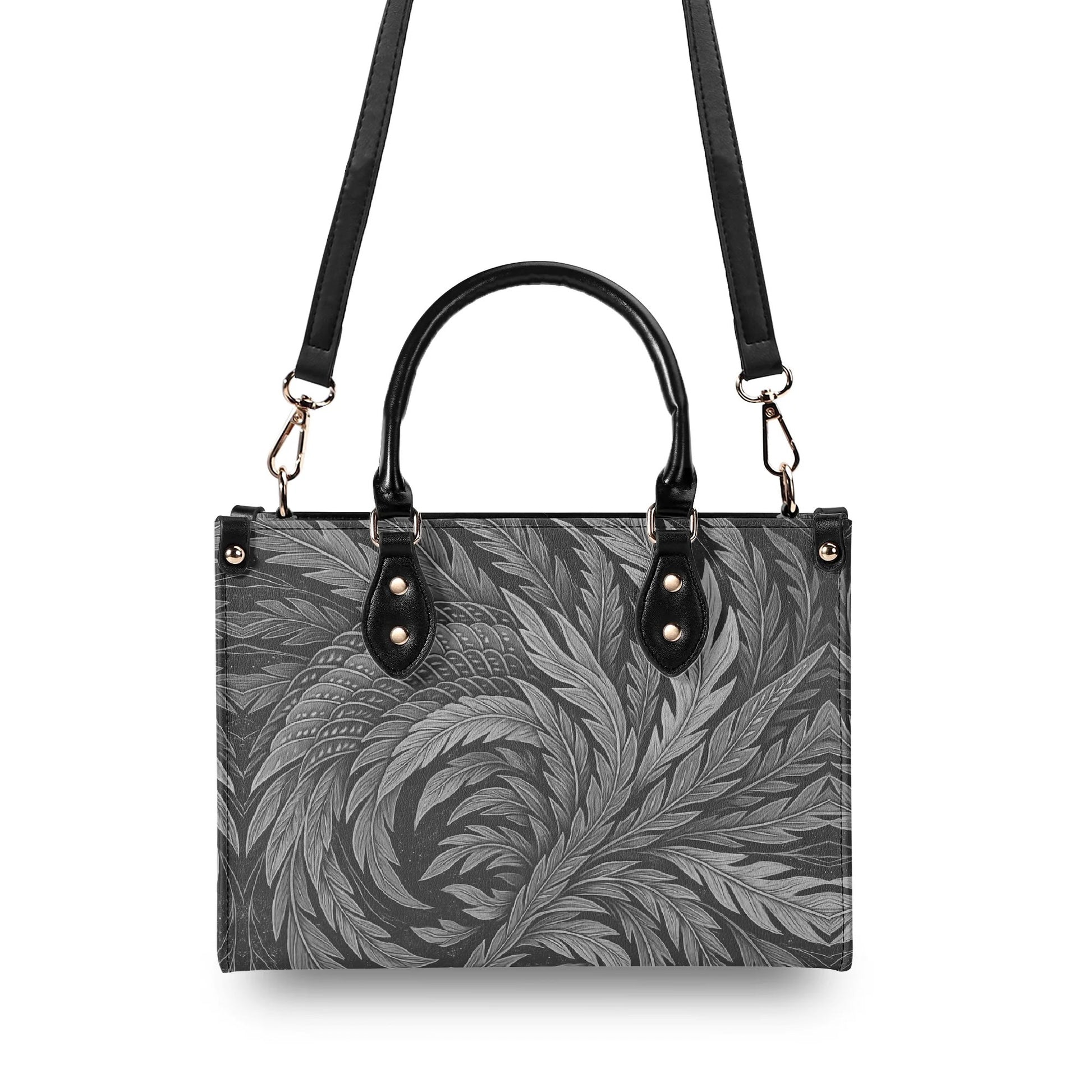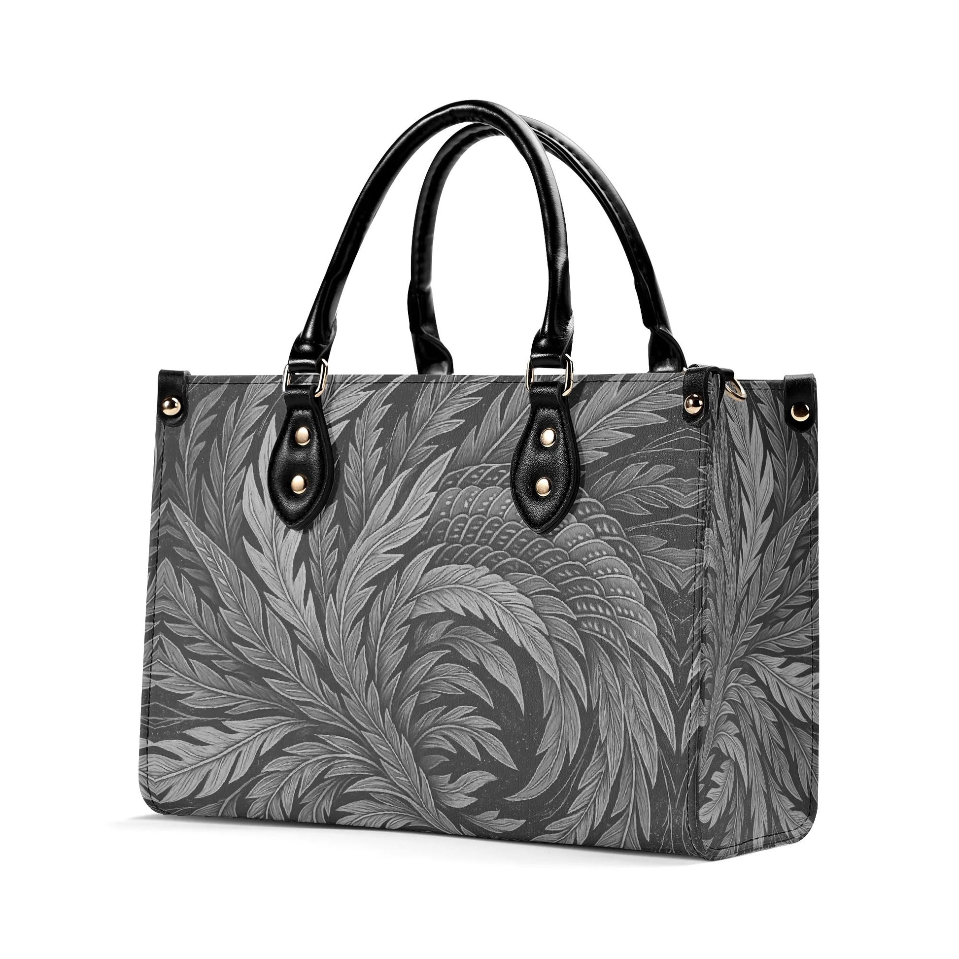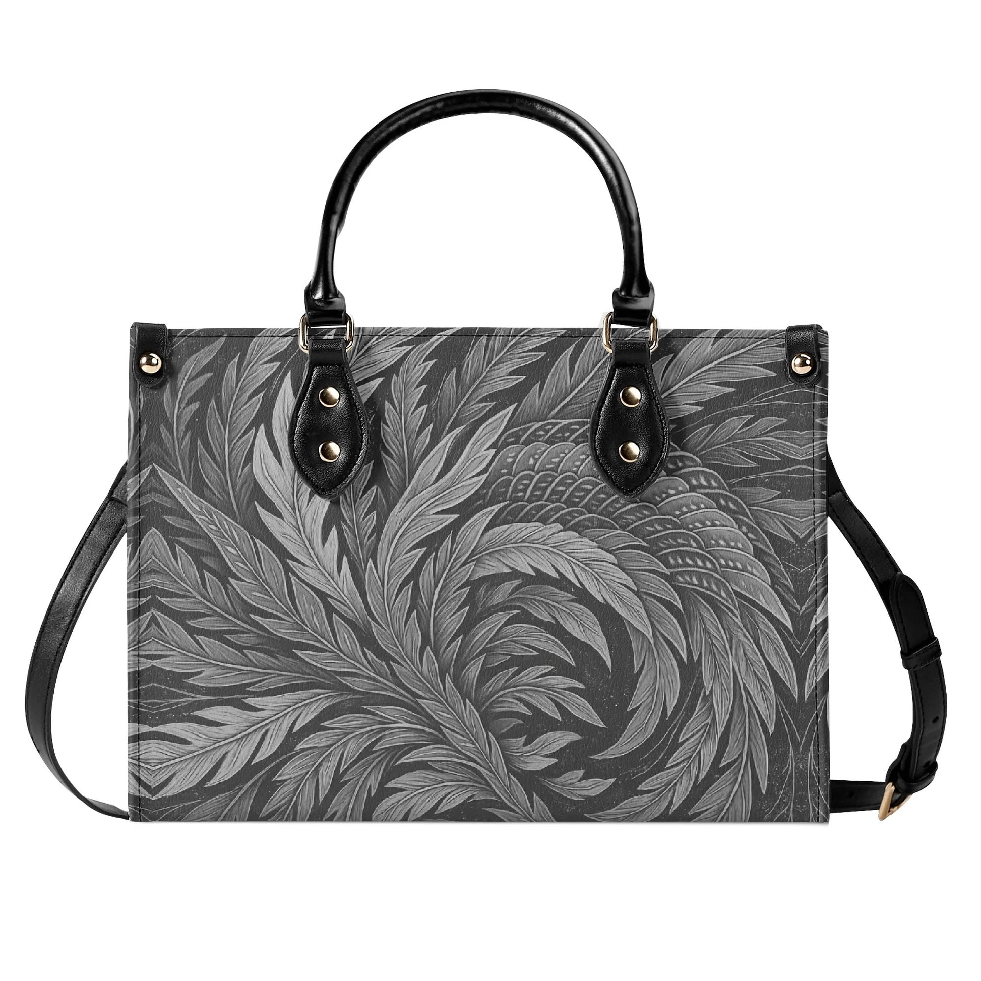 北斎フェニックスアートハンドバッグ - モノクロ|エレガントな日本の羽根飾りデザイン - 高級レディースPUレザーハンドバッグ