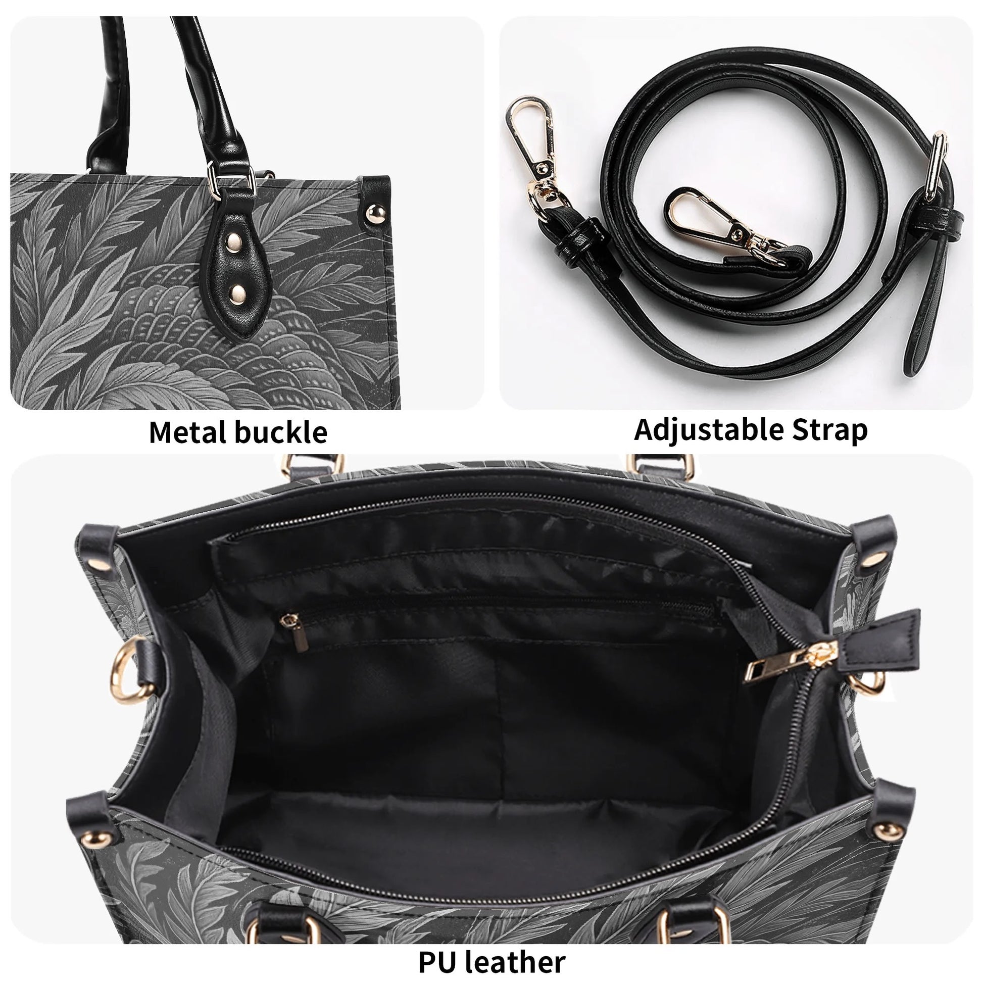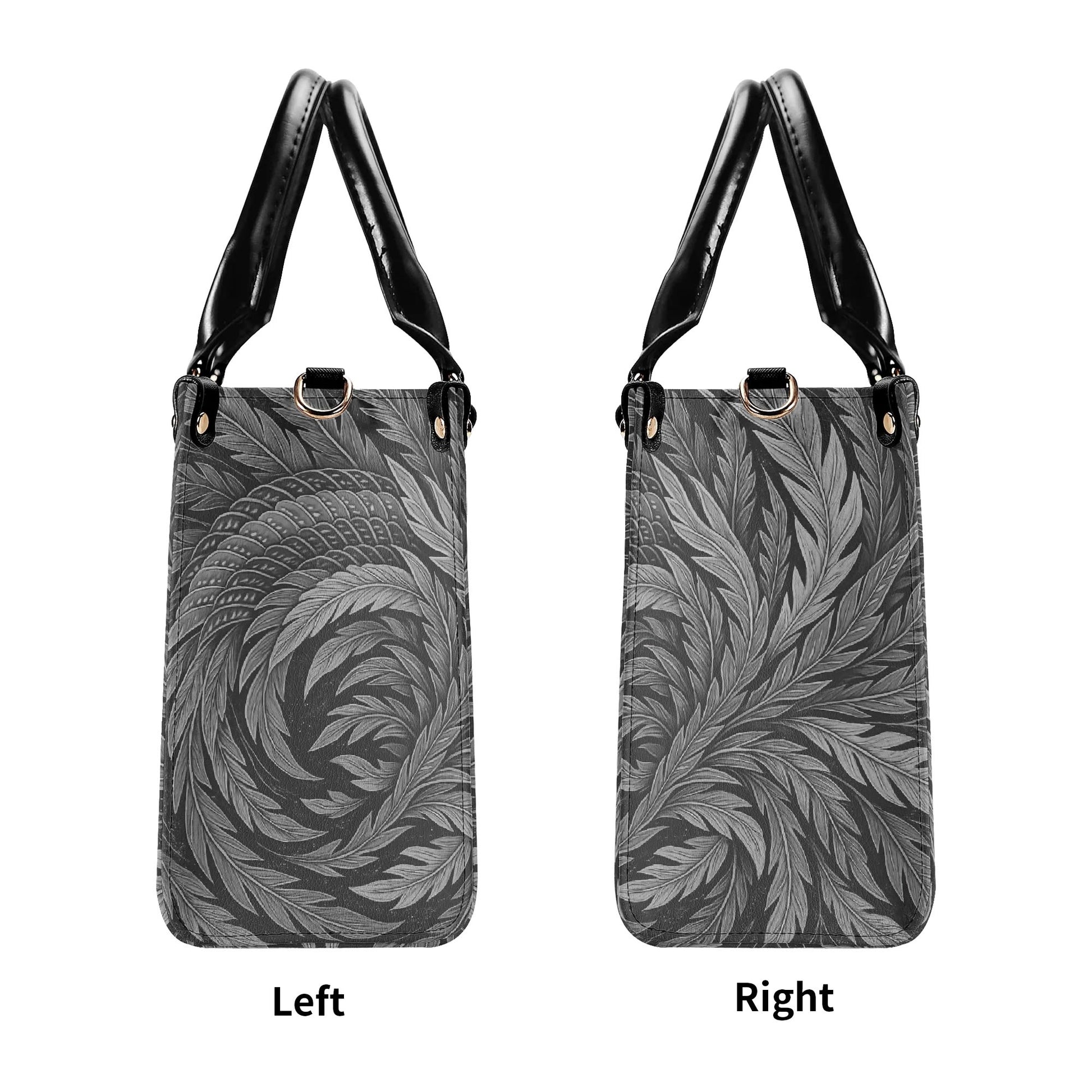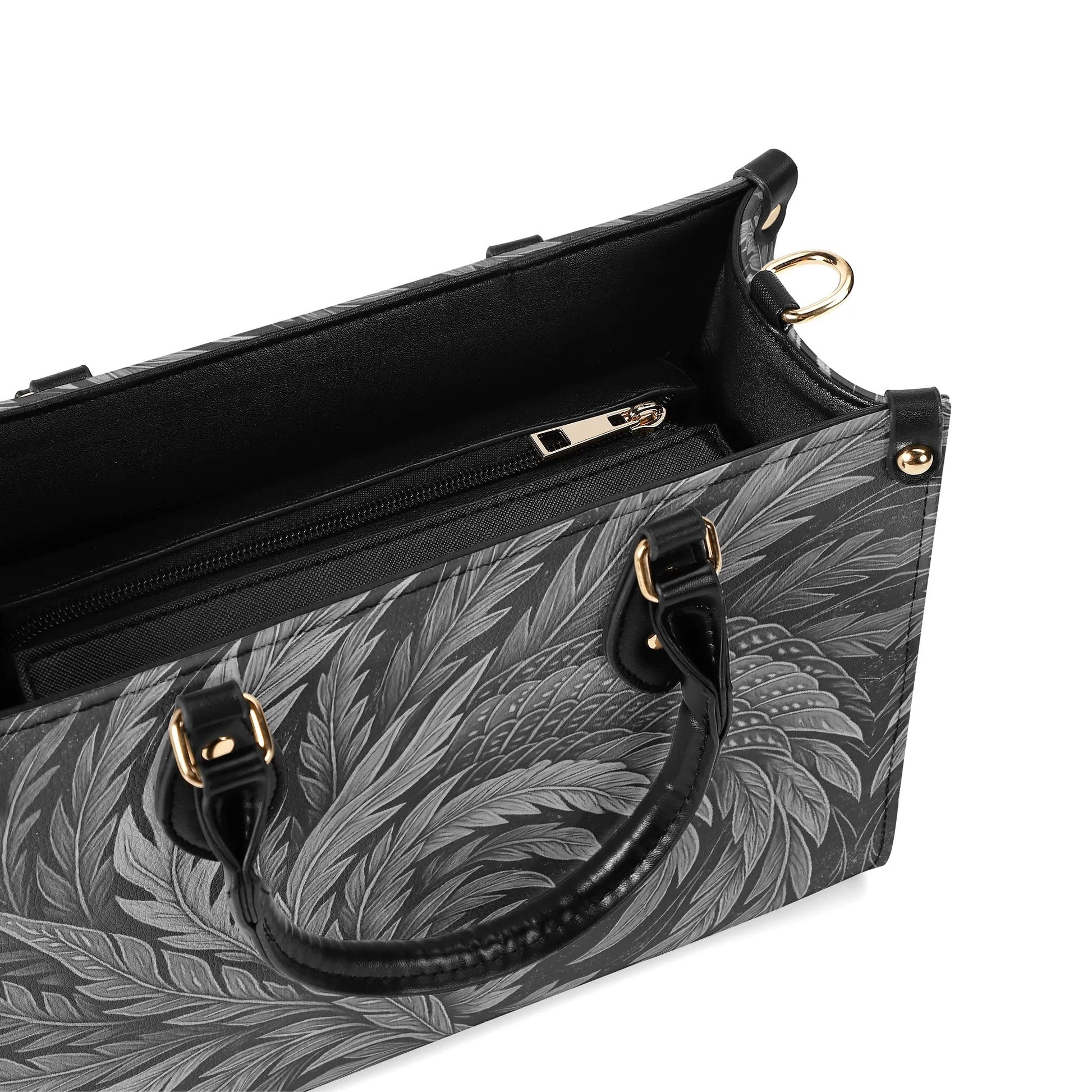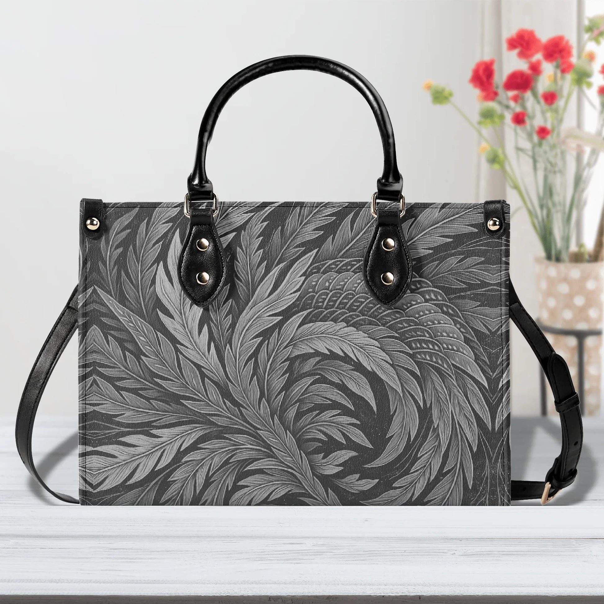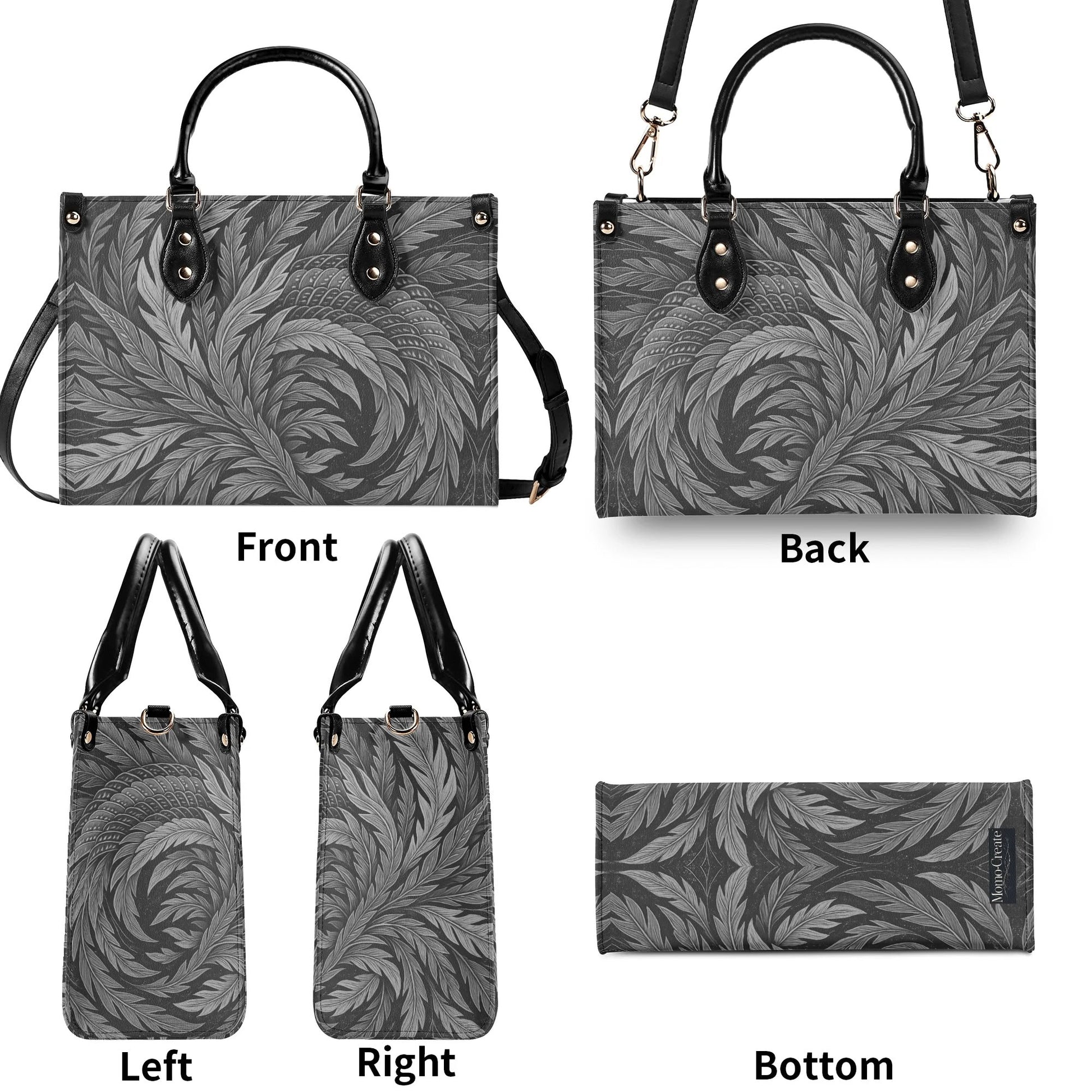 北斎フェニックスアートハンドバッグ - モノクロ|エレガントな日本の羽根飾りデザイン - 高級レディースPUレザーハンドバッグ