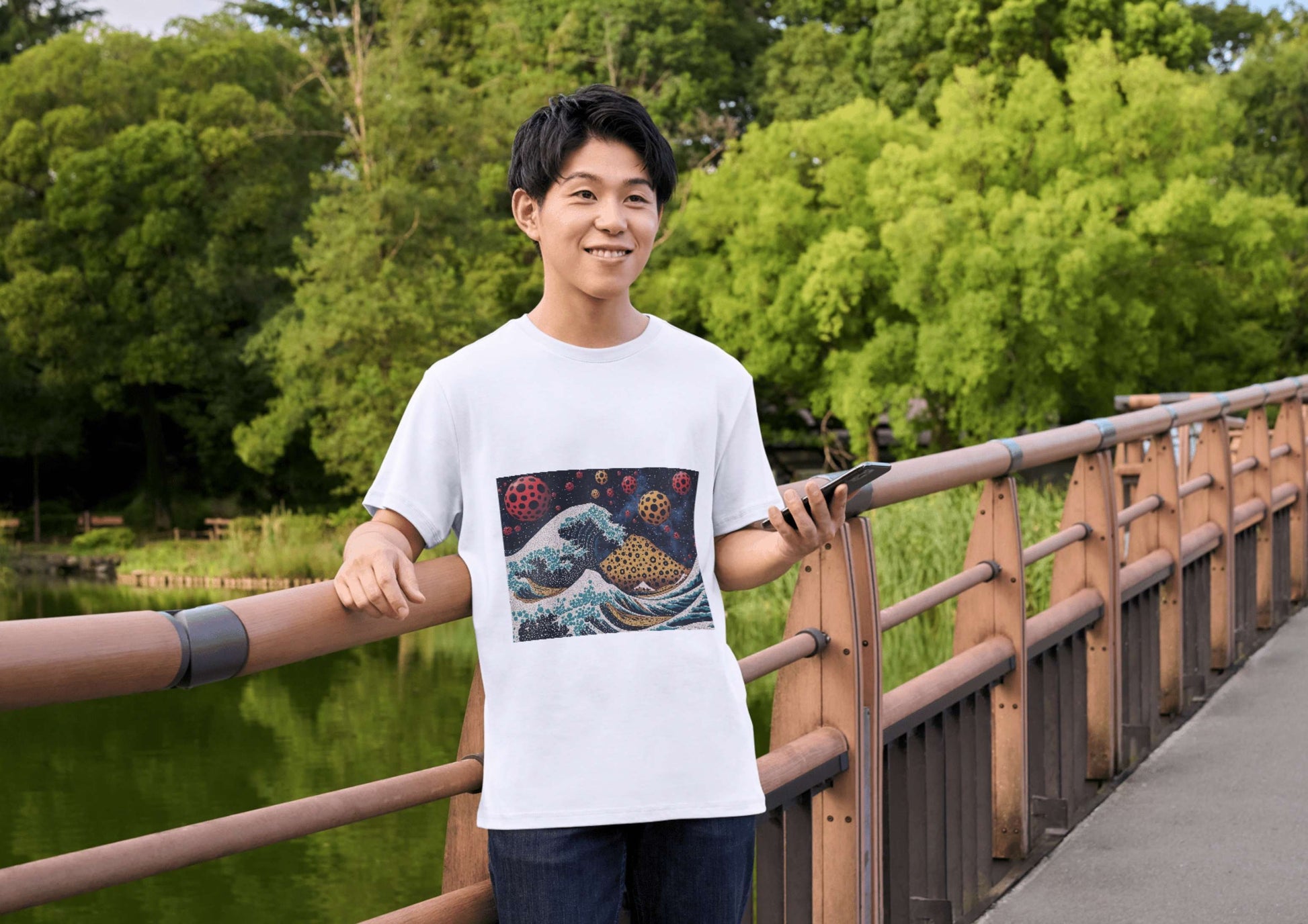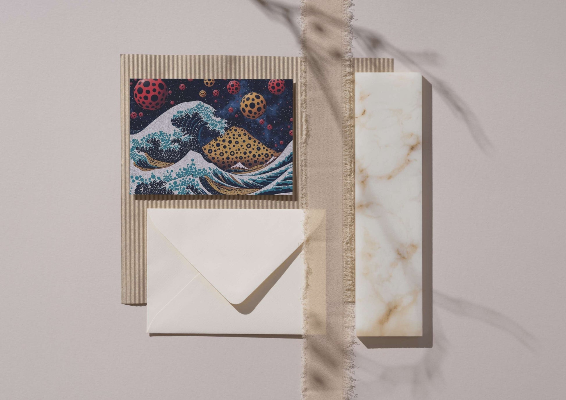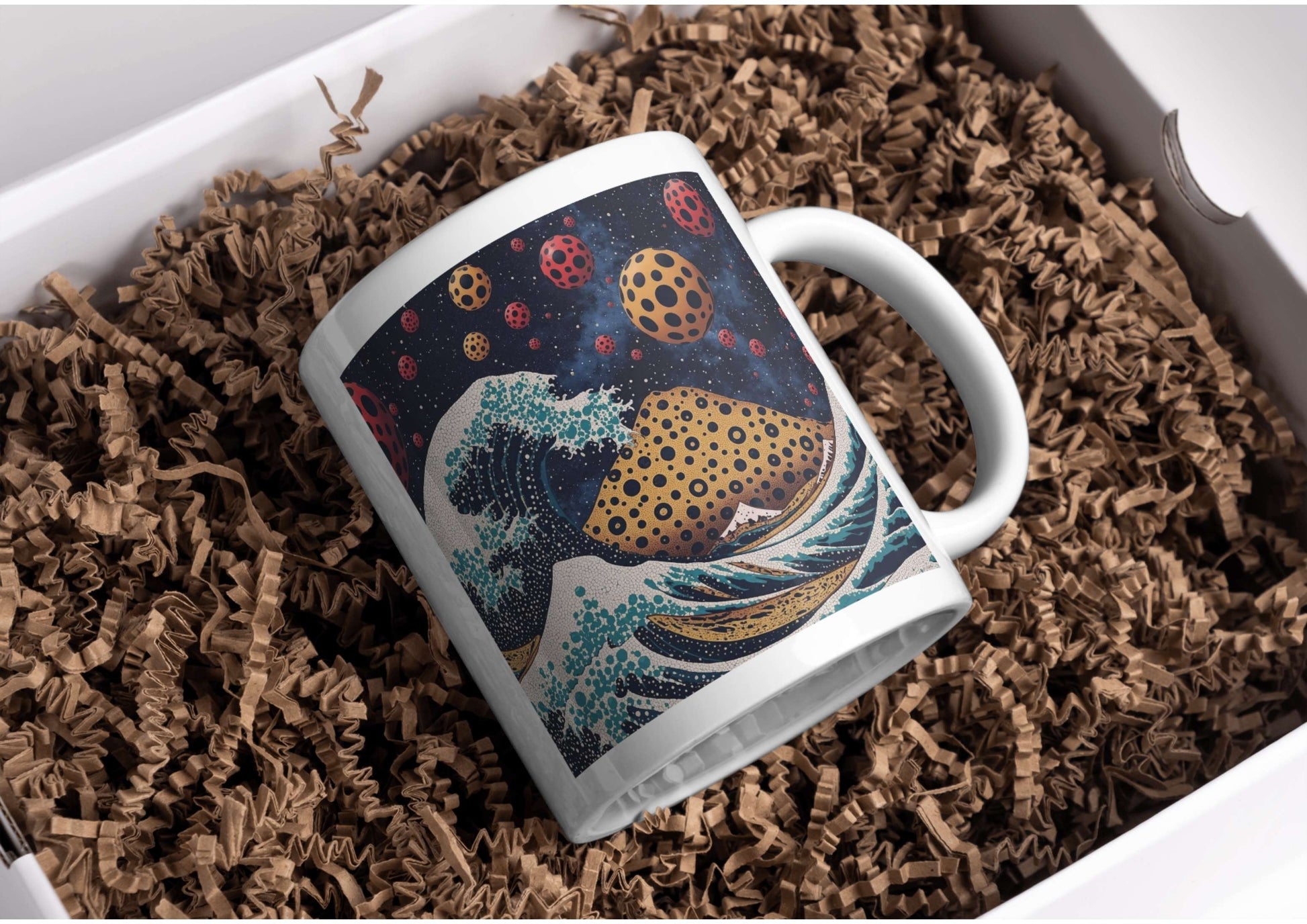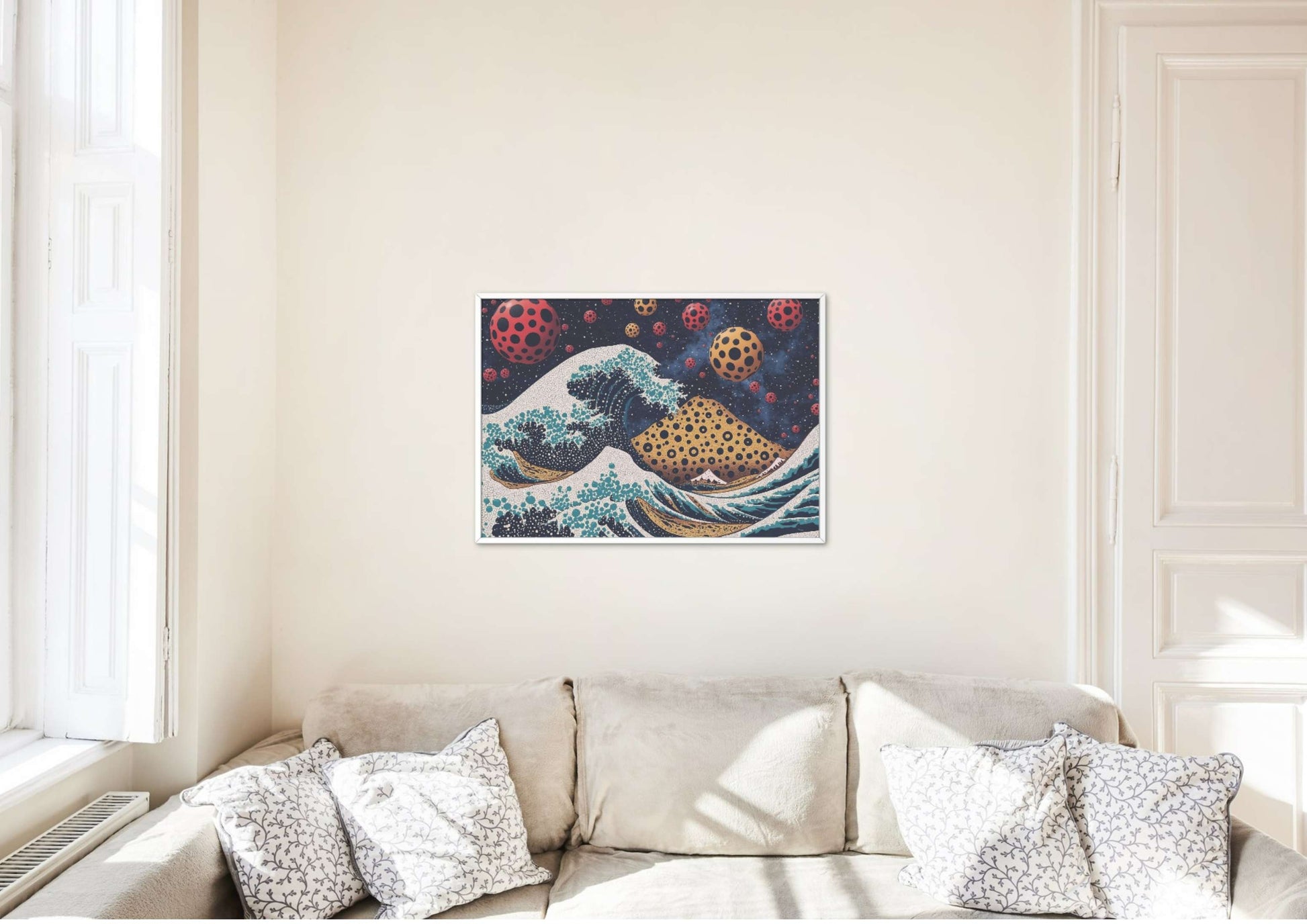 Experience a bold reinterpretation of Katsushika Hokusai’s The Great Wave off Kanagawa, infused with vibrant polka dot motifs inspired by contemporary pop art. Waves and Mount Fuji are transformed into a cosmic scene, where playful dotted spheres float against a starry night sky.