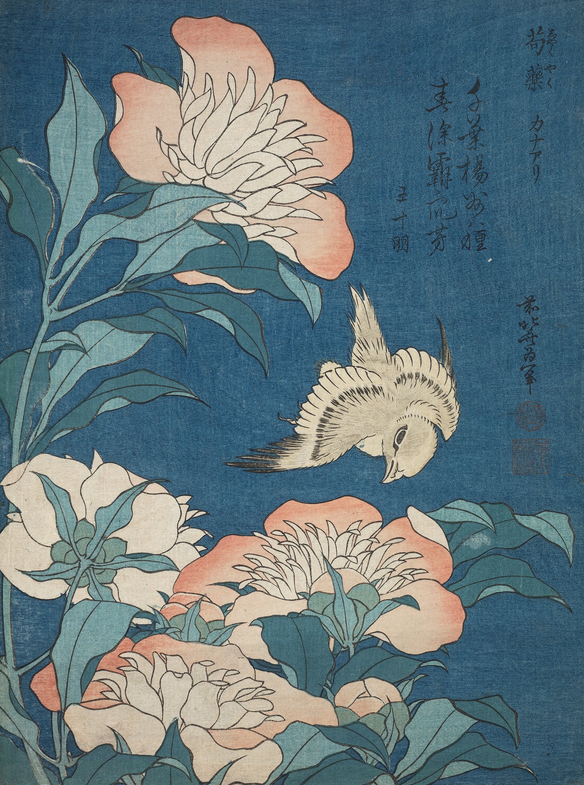 静かな嵐 - 葛飾北斎作 シャクヤクとカナリア 光沢マグカップ
