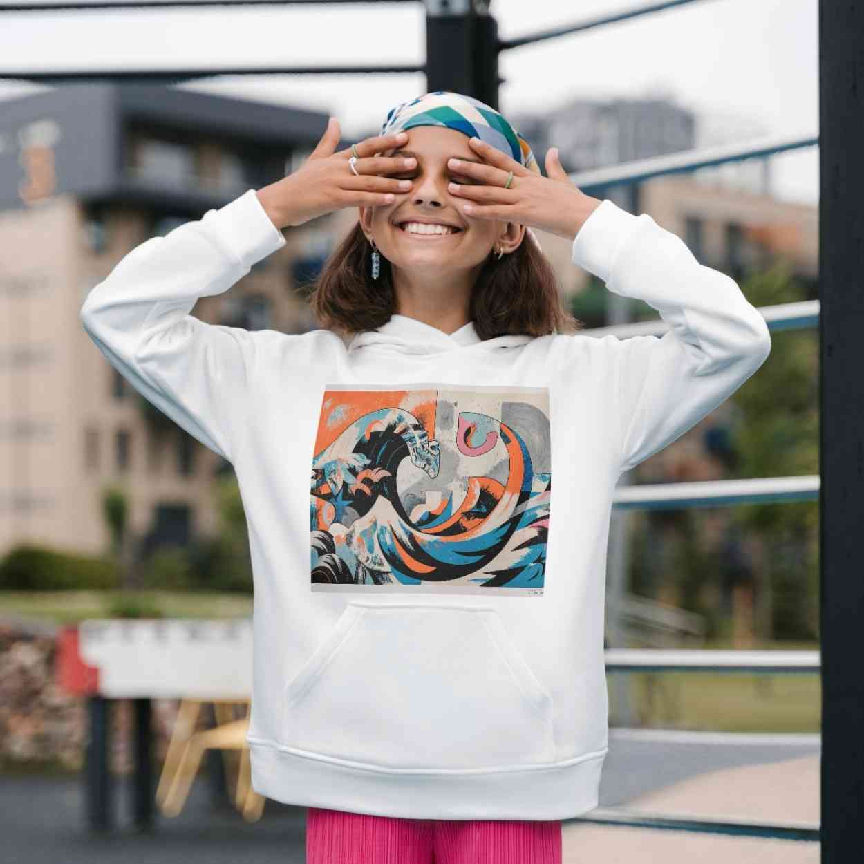 This digital artwork transforms the iconic wave into a symphony of geometry and motion — vivid orange, blue, and gray swirl into emotion and abstraction.