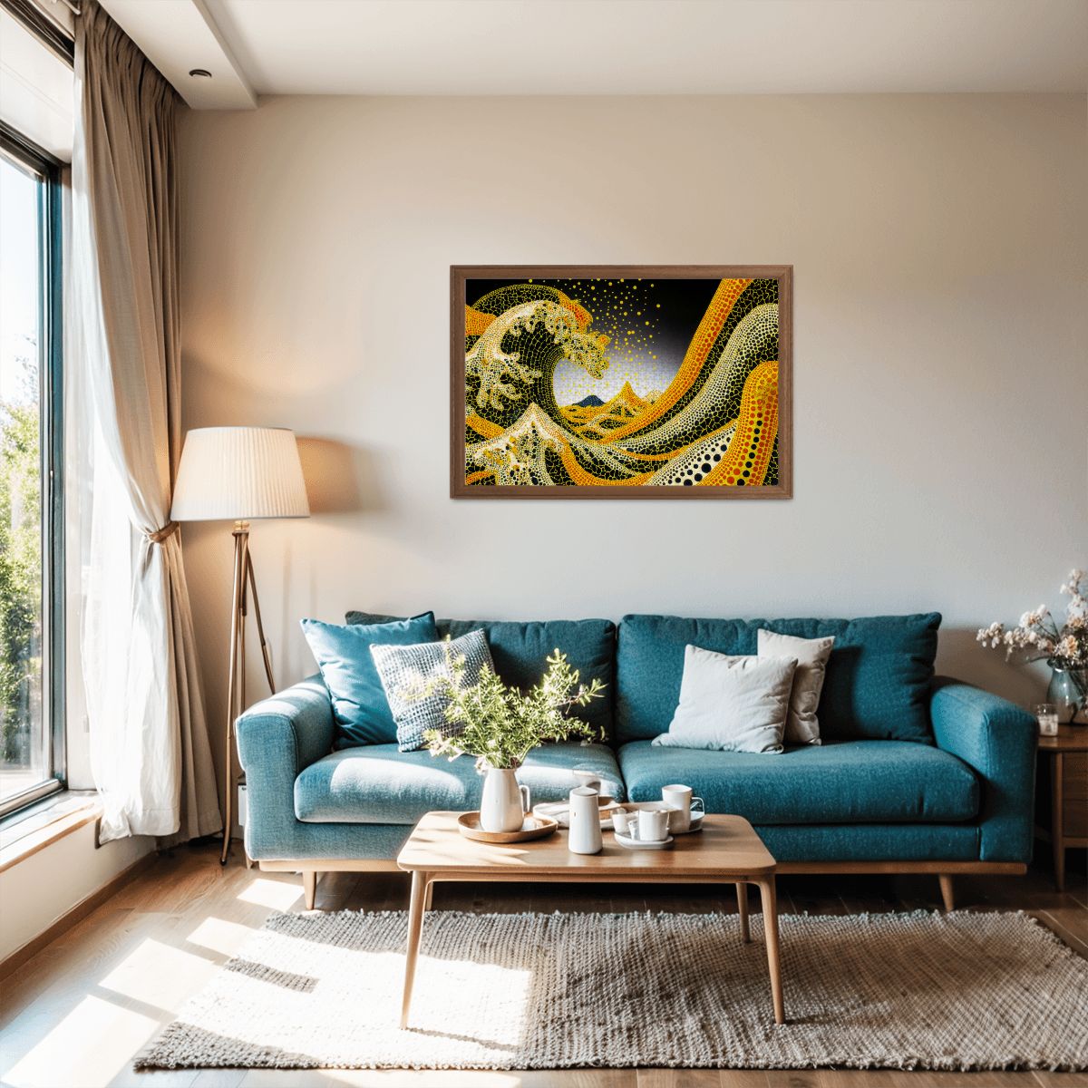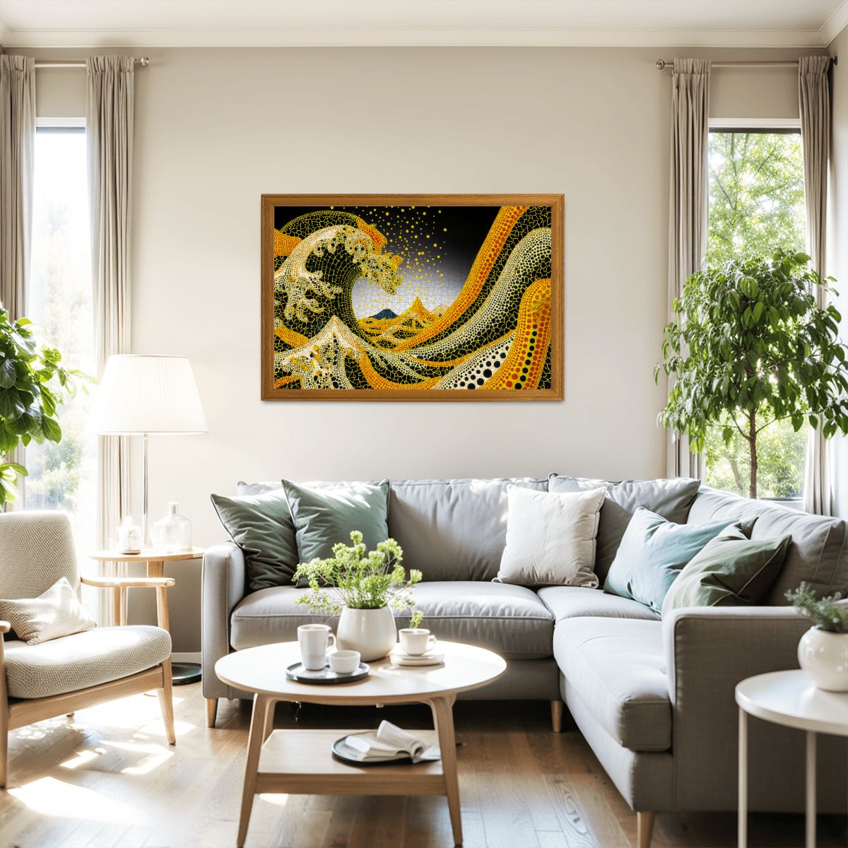 This artwork reimagines Hokusai’s The Great Wave off Kanagawa through the spirit of Yayoi Kusama’s pumpkins — symbols of strength, individuality, and infinite connection.